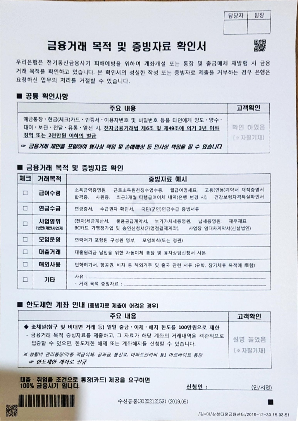 요새 금융관련하여 정부 정책이 강화되어-_- 급여수령, 대출거래, 해외사용, 사업 등 명확한 목적 및 증빙자료가 없으면 출금/해지/이체한도가 일100만원으로 제한되었다. 2019년부터. 아놔 별걸 다 하네..